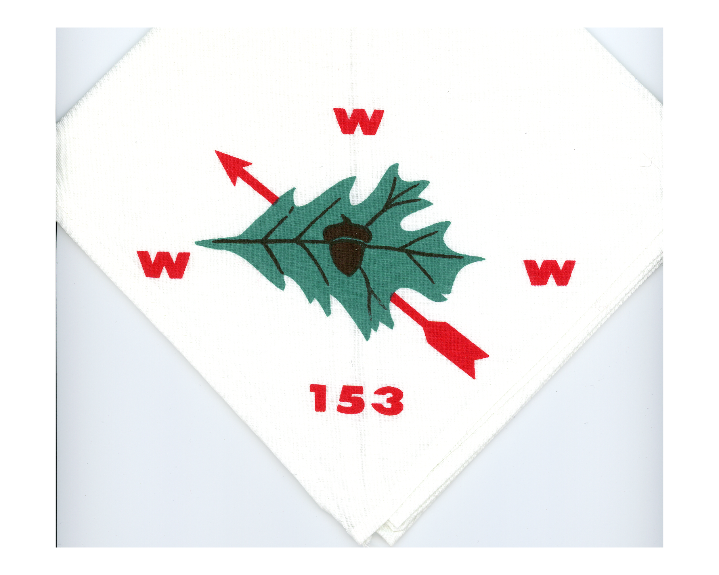 White silkscreened neckerchief. Red 153, Green oak leaf with10 rounded lobes, Red WWW, Black acorn.