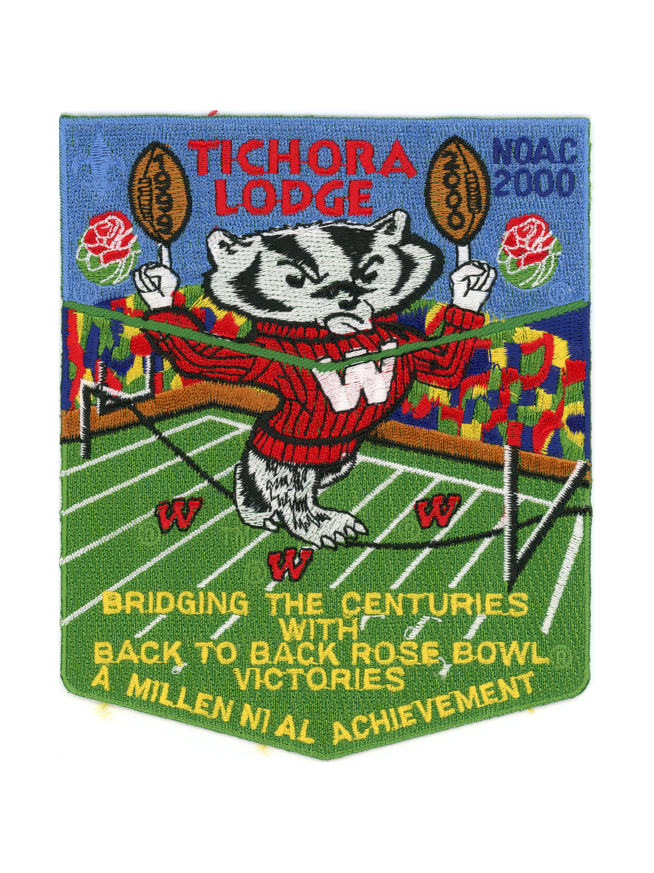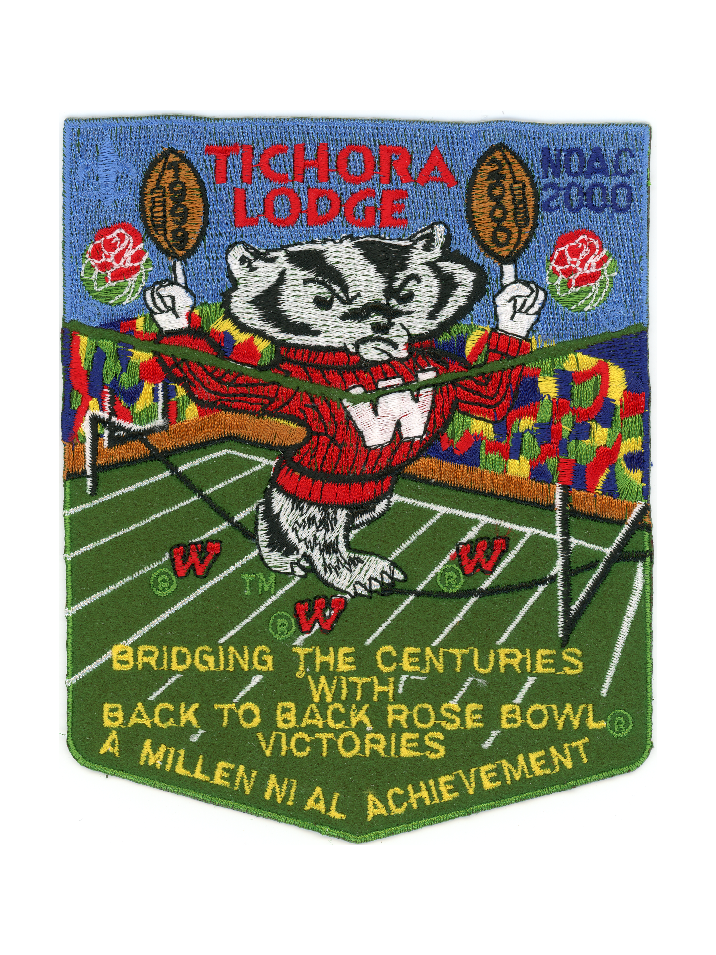 NOAC 2000, Bucky Badger, bottom part has embroidered field, uncut made to look like two part set.